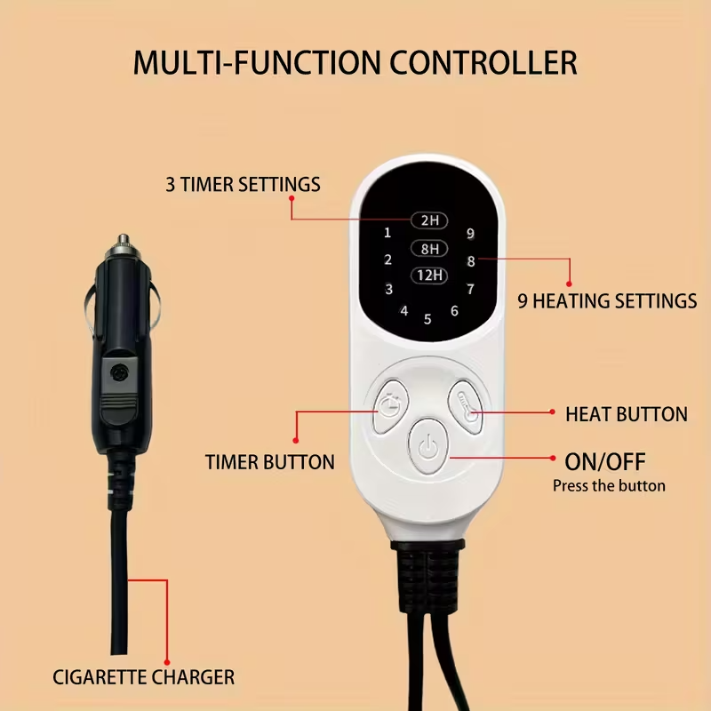 This 12V car heating blanket offers fast, reliable warmth for cold-weather travel. Designed to plug directly into any standard vehicle power outlet, the blanket heats quickly and provides nine adjustable temperature levels to suit personal comfort needs. Three timer settings—1 hour, 2 hours, and 4 hours—help ensure safe use and energy efficiency during long trips.