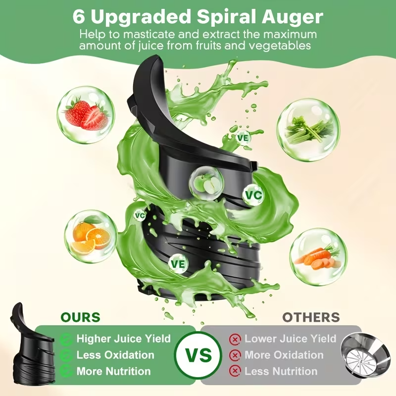Operating at 50 RPM, the slow grinding mechanism uses multi-stage progressive extrusion to minimize heat buildup and oxidation. This preserves more vitamins, nutrients, and natural flavors compared to traditional high-speed juicers, giving you a healthier and richer juice every time.