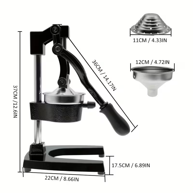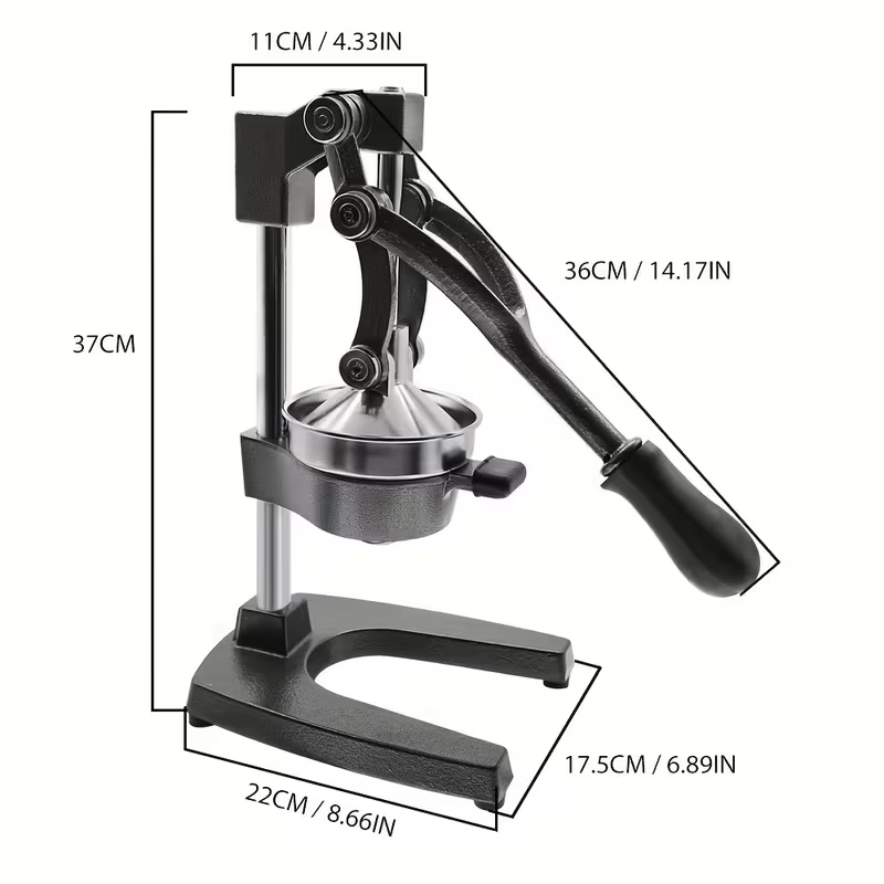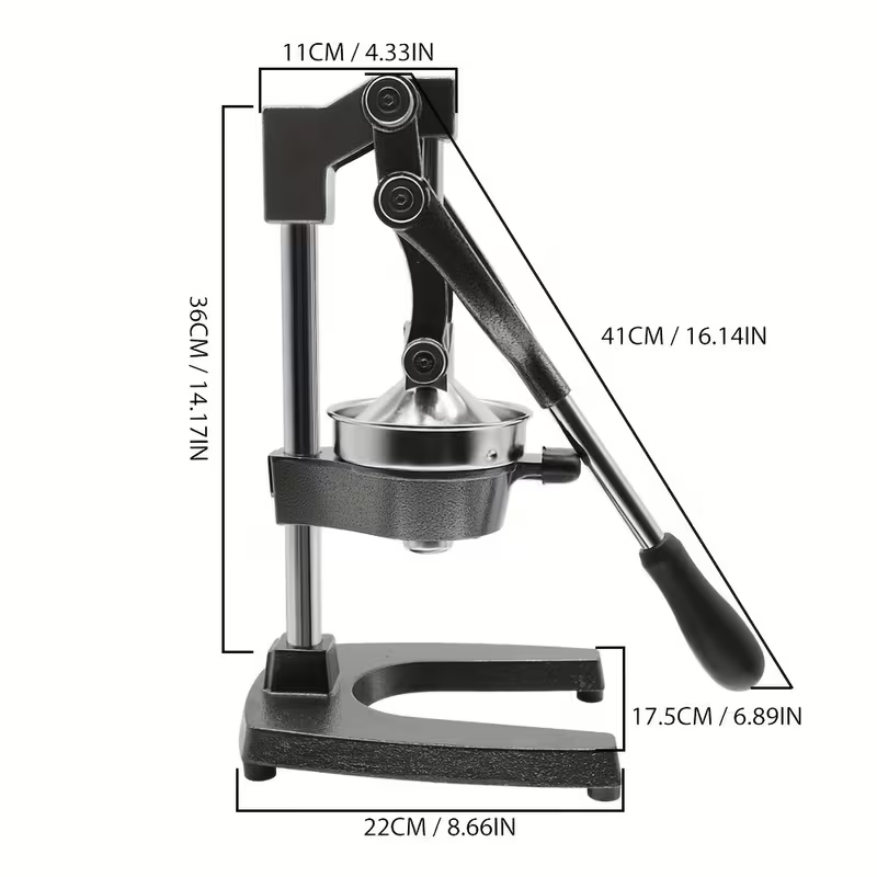 This heavy-duty manual citrus juicer is designed for efficient juice extraction in both home and commercial environments. Built with a durable cast iron base and a powerful lever-press mechanism, it delivers strong squeezing force with minimal effort. Suitable for oranges, lemons, limes, grapefruits, and pomegranates, it helps you achieve maximum juice output with less waste.