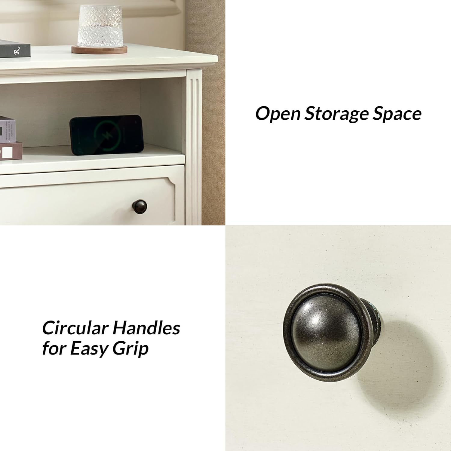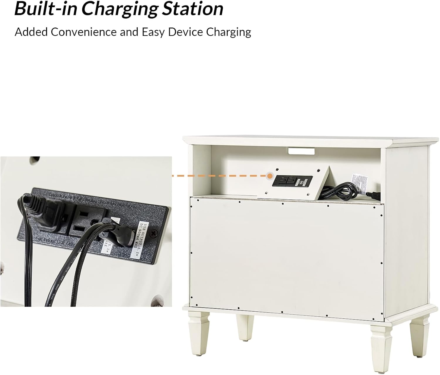 Farmhouse Nightstand Set of 2 with Charging Station – 2-Drawer Bedside Tables with Open Shelf, White Finish