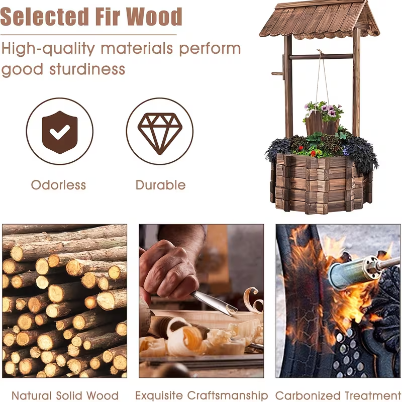 Bring timeless charm to your outdoor space with this Rustic Wooden Wishing Well Planter. Crafted from weather-resistant wood, it features a classic wishing well design with a decorative hanging bucket, adding warmth and character to any patio, yard, or backyard. The spacious planter is perfect for flowers, herbs, or succulents, while the sturdy construction ensures long-lasting outdoor use. A beautiful blend of natural aesthetics and functional garden decor, ideal for enhancing your garden, porch, or outdoor living area.